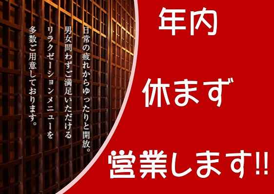 年末年始営業時間変更のお知らせです。12月30日(月) 通常営業12月31日(火) 10時~18時1月1日(水) 13時~19時1月2日(木) 10時~19時1月3日(金)~ 通常営業年内は休まず営業、年始は1日より営業致します。家の大掃除、会社の大掃除のお疲れに!!ご自身のお身体の大掃除もお忘れな…もっと見る
