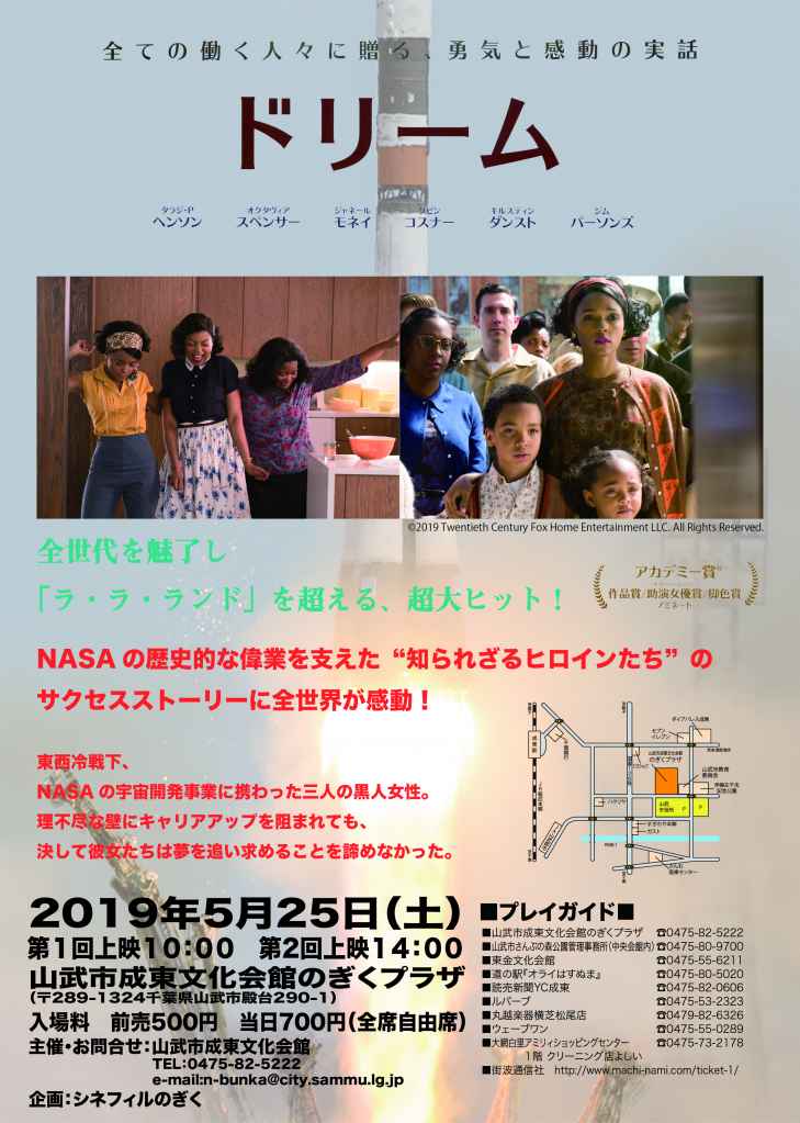 映画「ドリーム」【上映日】2019年5月25日 土曜日【時 間】1回目 10時~ / 2回目 14時~ 2回上映入替制【入場料】全席自由 前売:500円 当日:700円 チケット発売中!!【会 場】山武市成東文化会館のぎくプラザ東西冷戦下、NASAの宇宙開発事業に携わった三人の黒人女性。理不尽な壁に…もっと見る -