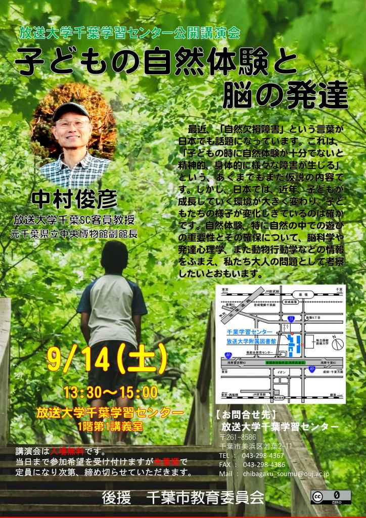 放送大学千葉学習センター公開講演会『子どもの自然体験と脳の発達』最近、「自然欠損障害」という言葉が日本でも話題になっています。これは、「子どもの時に自然体験が十分でないと精神的、身体的に様々は障害が生じる」という、あくまでもまだ仮説の内容です。しかし、日本では、近年、子どもが成長していく環境が大きく…もっと見る
