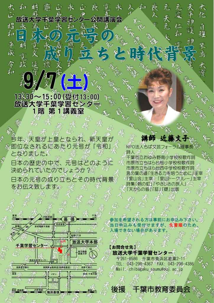 放送大学千葉学習センター公開講演会『日本の元号の成り立ちと時代背景』今年、天皇が上皇になられ、新天皇が即位なされるにあたり元号が「令和」となりました。日本の歴史の中で、元号はどのように決められていたのでしょうか?日本の元号の成り立ちとその時代背景をお伝え致します。開催日/2019年9月7日(土)時間…もっと見る