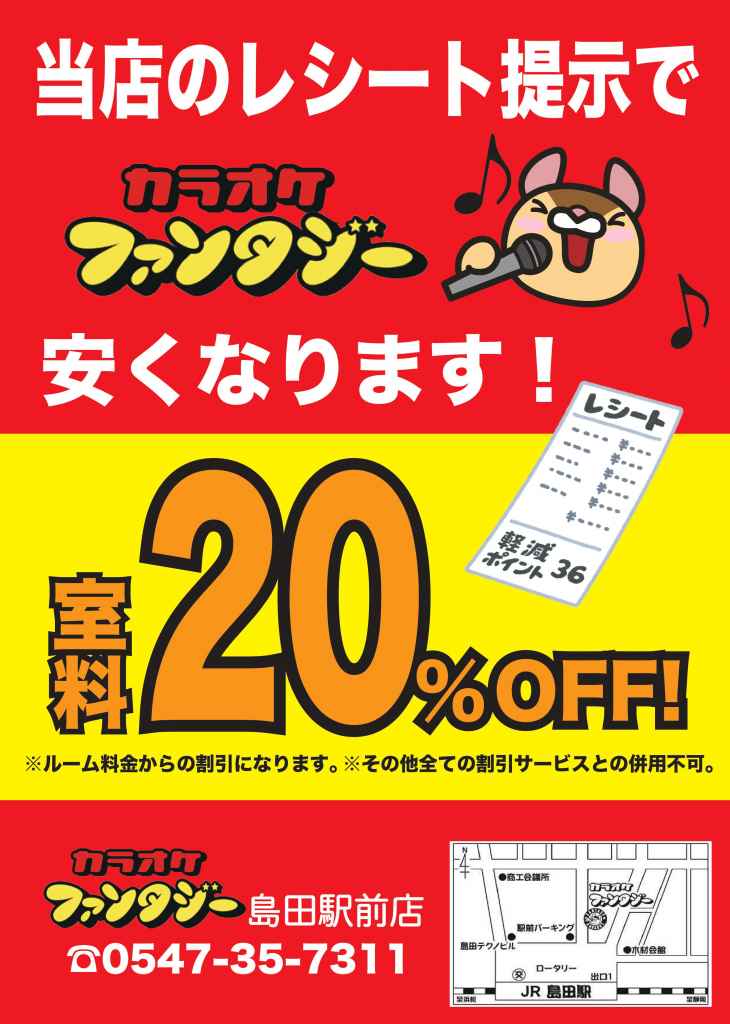 本日は島田駅周辺の居酒屋様をご利用になっている方へのお得な情報をお届け致します当店では近隣の居酒屋様へチラシを貼っていただいておりますこのチラシの貼ってある居酒屋様の当日お会計レシートをご持参いただくとカラオケファンタジーご利用の室料20%OFF!とさせていただいております島田でカラオケと言ったらフ…もっと見る