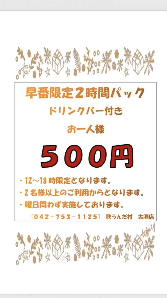歌村の新しいクーポン内容をご紹介します!今度は12時〜18時限定!2時間パックドリンクバー付きがなんとお一人様ワンコイン500円でご案内出来るクーポンです♪何度かブログでご紹介しておりますが、当店のドリンクバーはとても充実しております!☆ソフトクリーム食べ放題☆☆お味噌汁飲み放題☆もついて1人500…もっと見る
