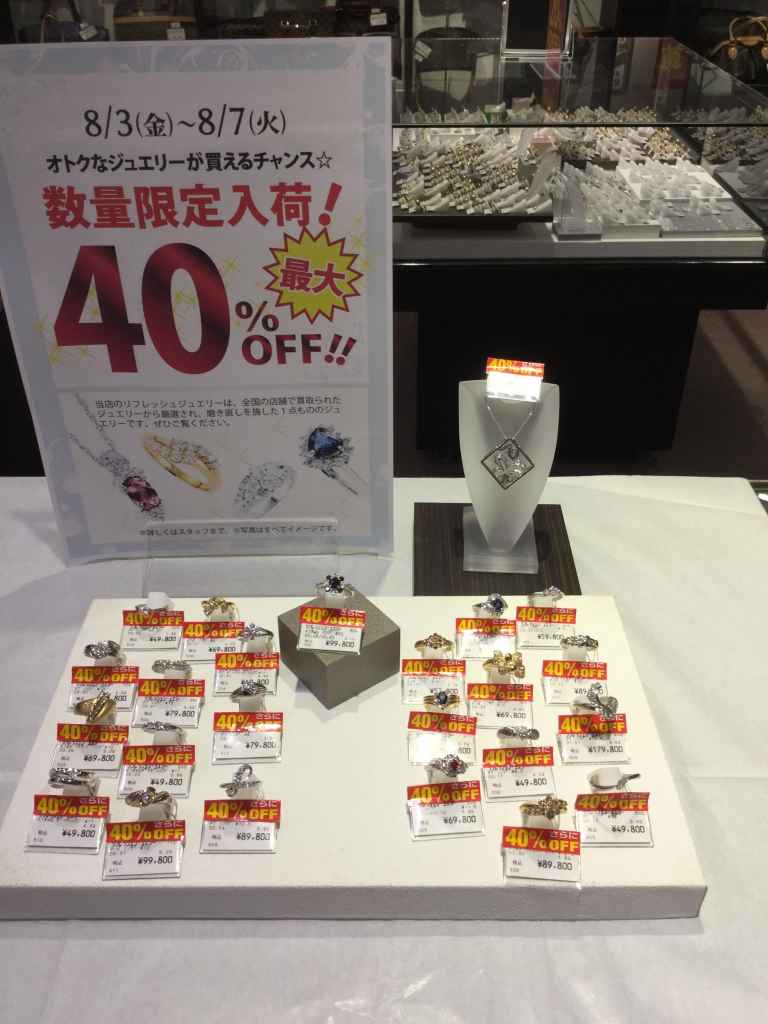 8/3(金)~8/7(火)の5日間で素敵なジュエリーがおトクに買えるチャンスです‼リングもネックレスもお手頃価格から更に40%OFF✨数量限定ですのでお早めにお越しください!もっと見る