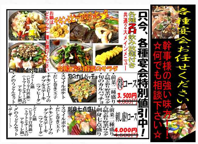 仕事帰りのちょい飲みから、仲間内での飲み会、大人数での宴会まで楽しく美味しい時間をぜひ当店でお過ごし下さい。
