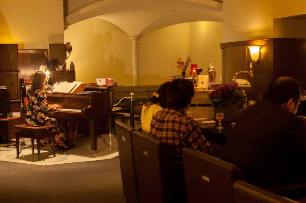 中に入ると重厚な雰囲気と落ち着いた照明の空間が広がり、ヨーロッパ調でクラシカルな内装にマッチするブラウンのグランドピアノ、そしてカウンターにてバーテンダーがお出迎えいたします。