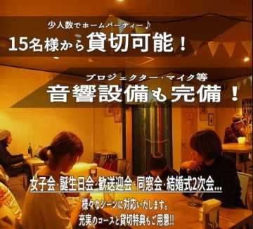 ワッフルパンケーキプレゼントとプロジェクターで映し出すオリジナルムービーで大人気の誕生日、記念日のサプライズから、貸切パーティー、歓送迎、慰労会、結婚式の二次会など様々なシーンに最適なコースを各種ご用意しています。15名様より貸切にも対応いたします。
