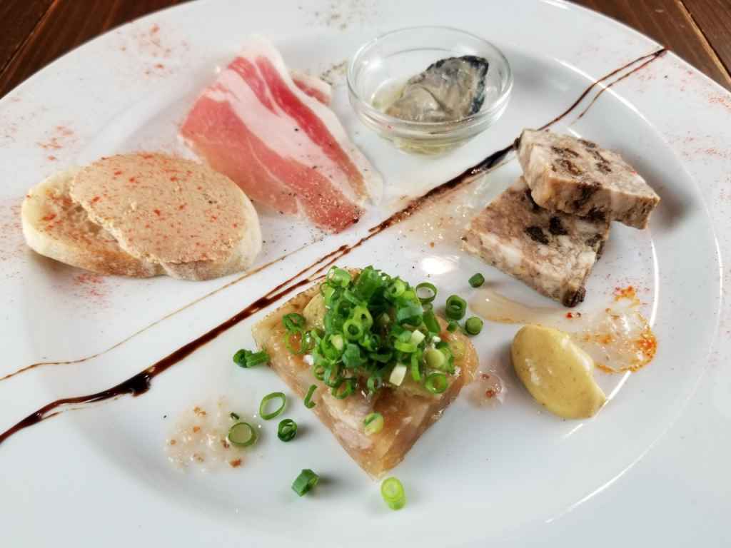 2019ちーバルメニュー 職人技の詰まったオードブル盛り合わせ ☆パテドカンパーニュ ☆イモ豚肉の生ハム ☆豚足のジュレ寄 ☆広島県産牡蠣の燻製 ☆絶品レバームース