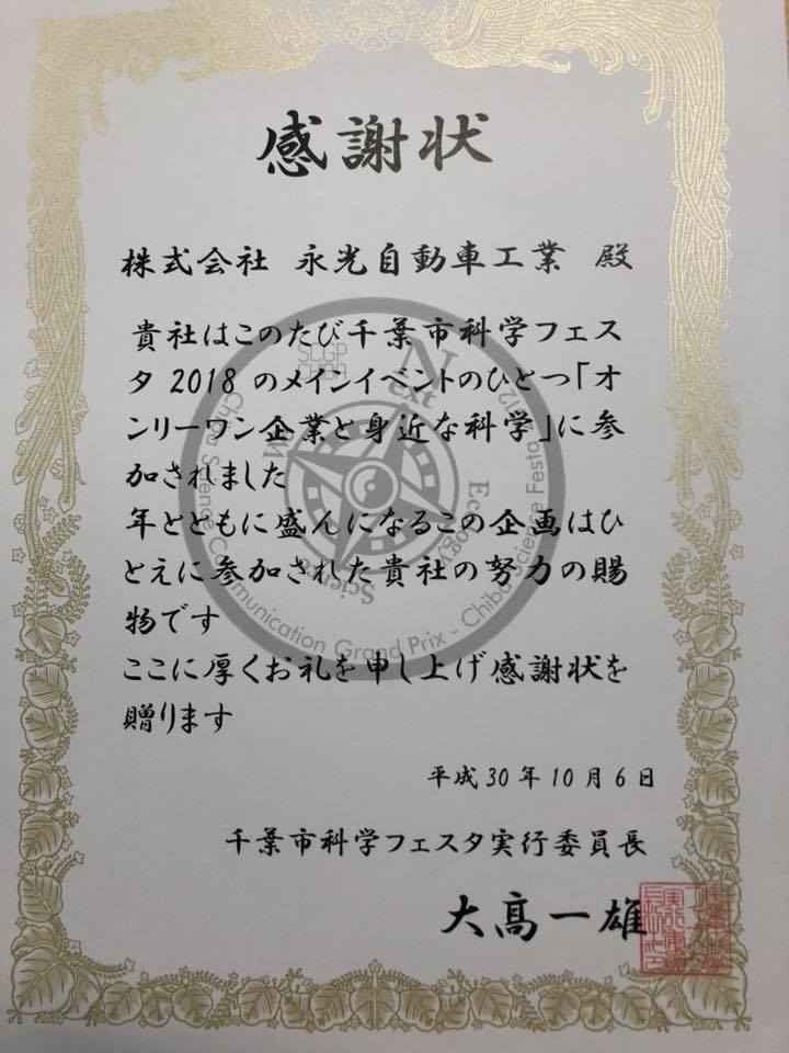 千葉市科学フェスタ実行委員長さまより感謝状をいただきました‼️