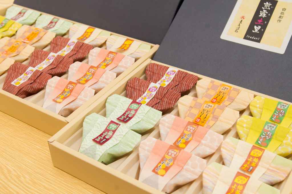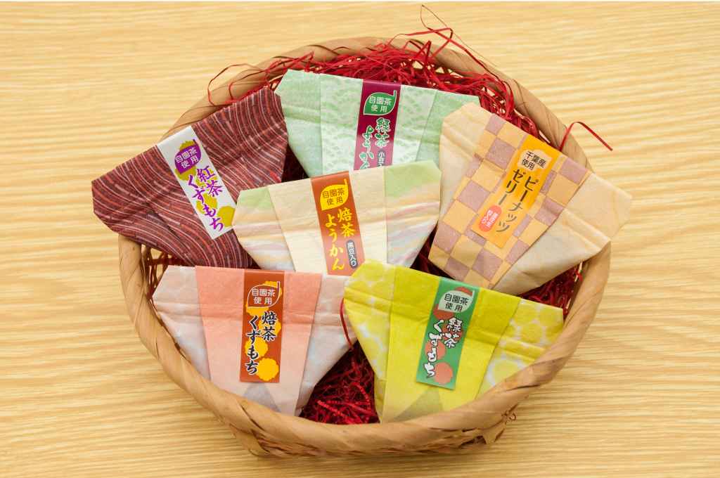 自社創作『煎露土里(いろどり)』です。抹茶ようかん、抹茶くずもち、ピーナッツようかん、ピーナッツゼリー、焙茶ようかん、焙茶くずもちが入ったアソートになっております。ご贈答、法事等の返礼などに大変好評をいただいております