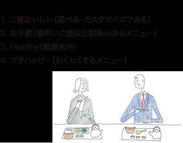 今日はヘルシーに、明日はがっつりとお肉に…など、その日その日の気分に合わせても選ぶ楽しみを体感いただけるメニューを 揃えてます。