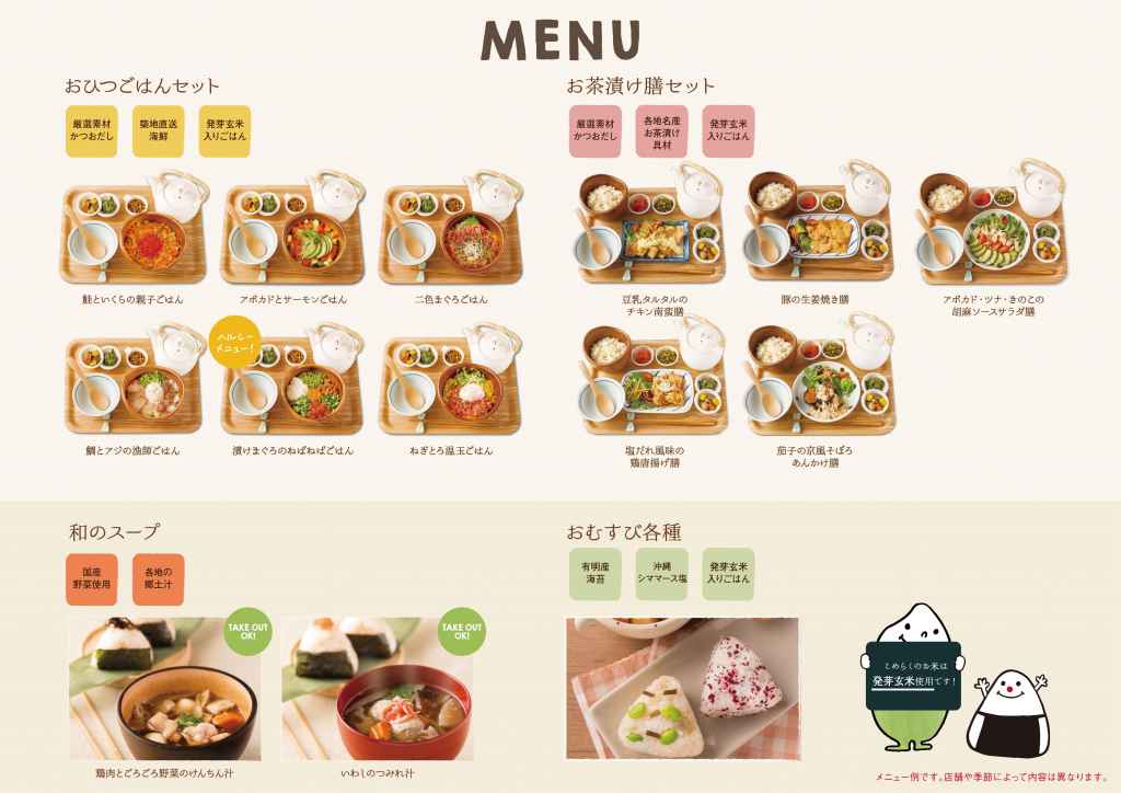 ゆっくりお食事を楽しみたい立地には「おひつごはんセット」、忙しい方が多い立地にはさっとテイクアウトしていただける「おむすび」、温かいスープをメインで召し上がりた方には「和のスー プとおむすびセット」など幅広い年代層のそれぞれの立地の生 活ニーズに合わせたスタイルで展開しています。