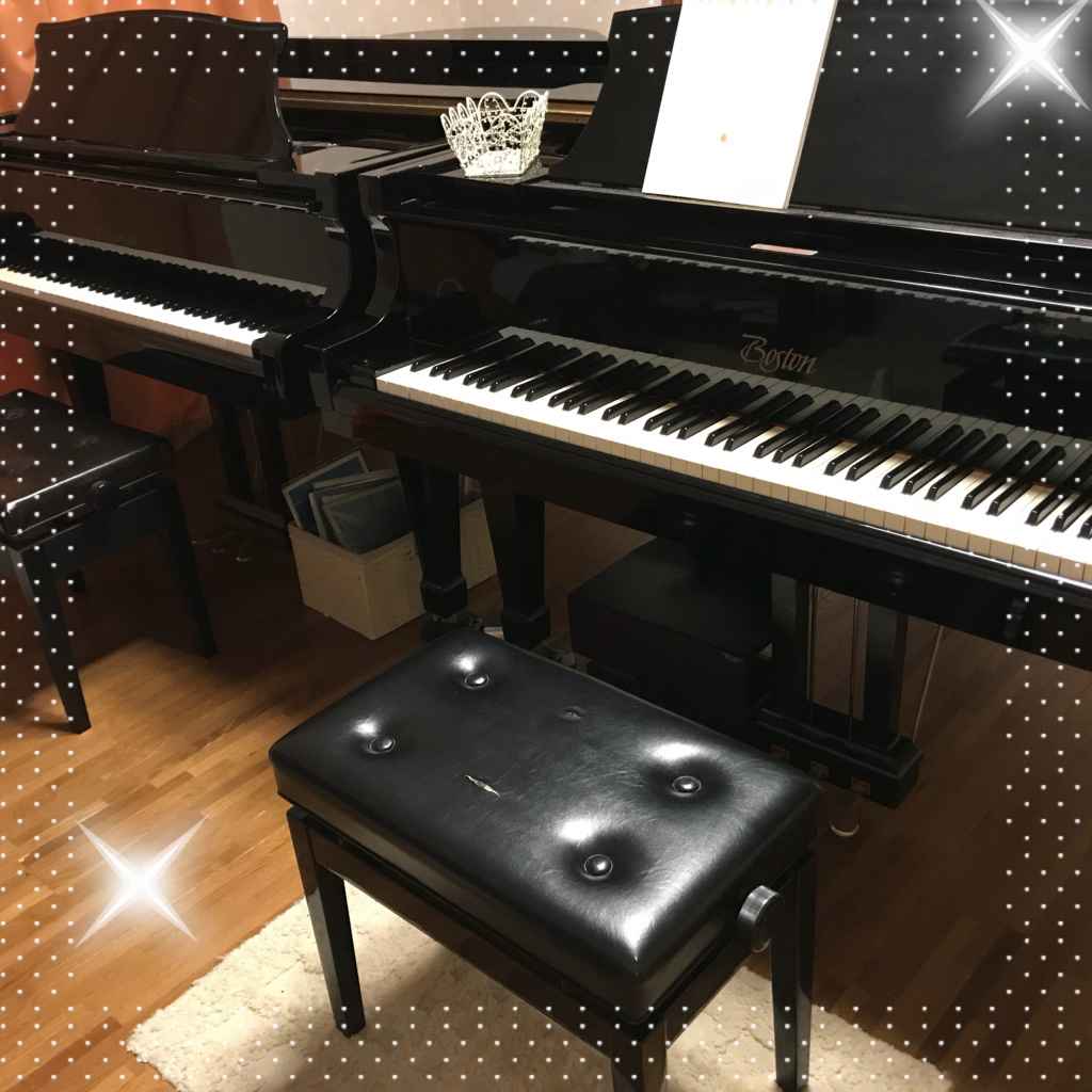【内観】 グランドピアノ2台で指導しております、3歳から74歳までの生徒さんが在籍しています。