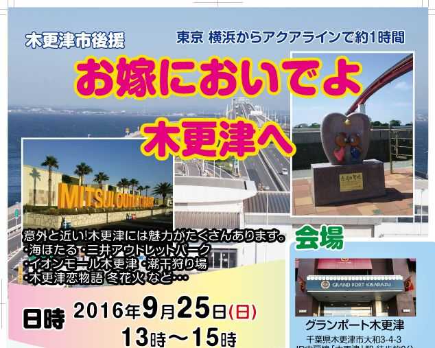 【サービス・メニュー】 2016年9月木更津市後援“お嫁においでよ木更津へ”開催致しました。女性には都内・神奈川よりアクアラインバスをご利用いただき、アクセスの良さを実感いただきました。