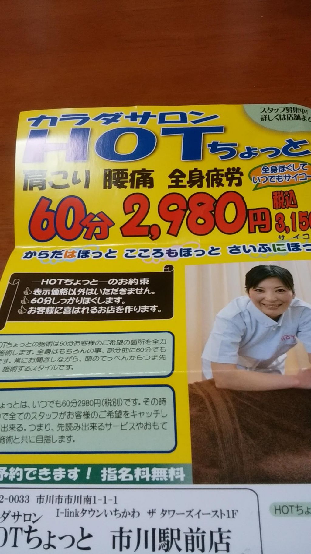 「オニオンを見た」とお伝えいただくとスムーズです。スポット名 市川リラクゼーションサロン 2980円 HOTちょっと市川駅前店