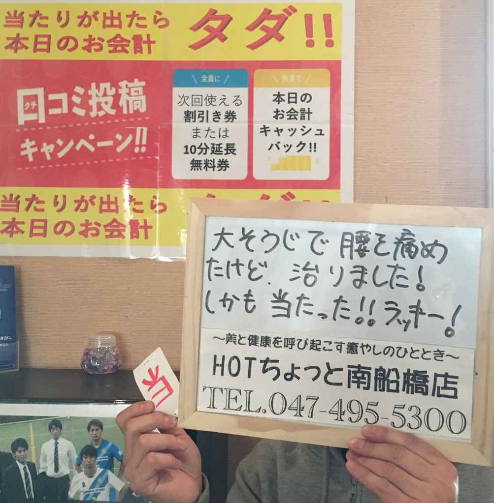 抽選クジで見事に当たりをゲット!! おめでとうございます!!動画で紹介!肩こり 腰痛 格安 1600円~ 駅チカ マッサージ サロン HOTちょっと ビビット 南船橋 店