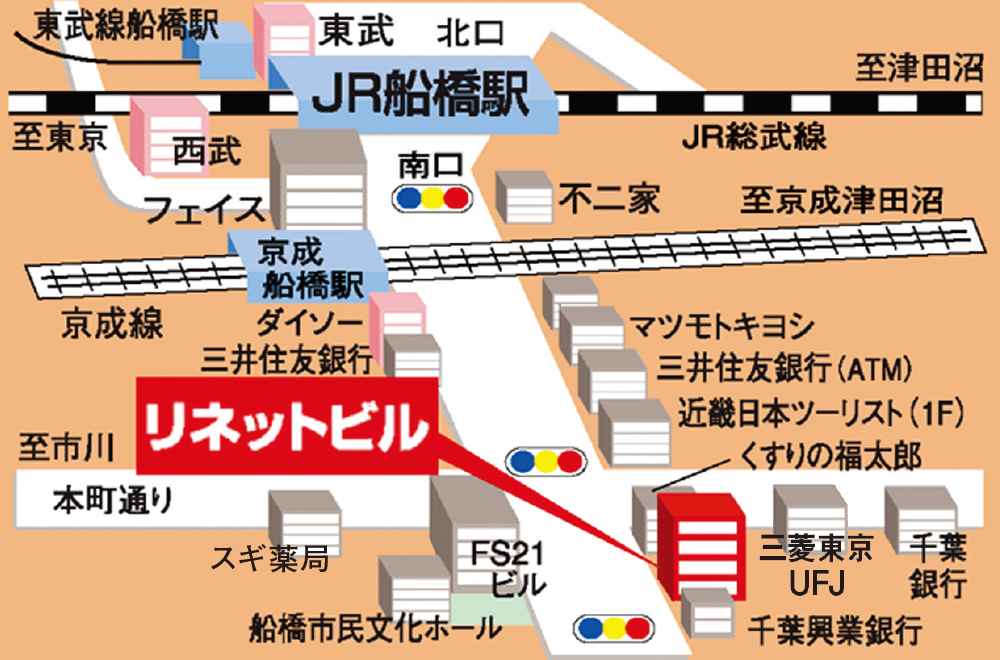 船橋駅から徒歩5分、スクランブル交差点の近くです。