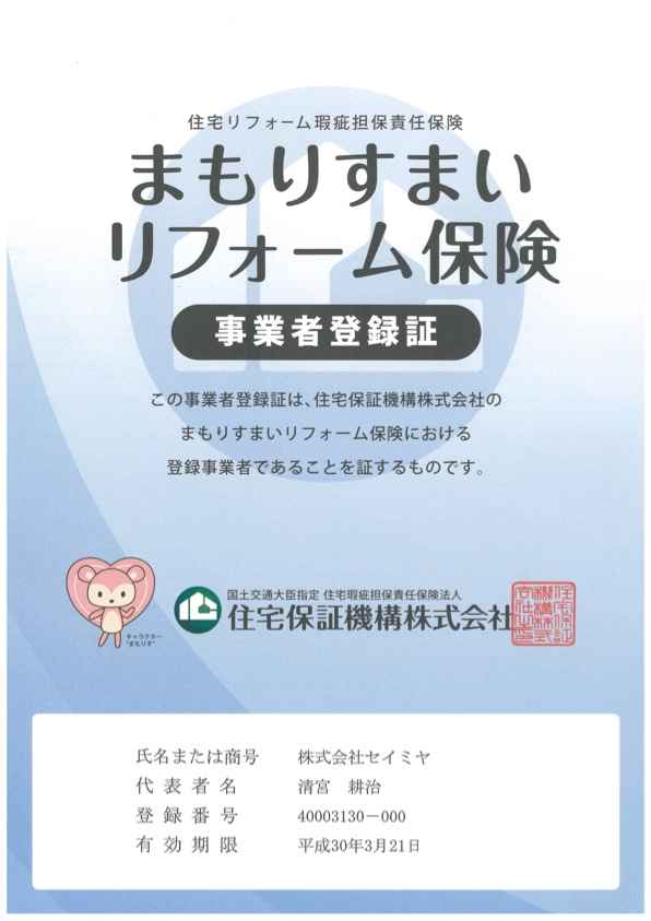 セイミヤは、住宅保証機構の「まもりすまいリフォーム保険」の事業者登録を受けています。