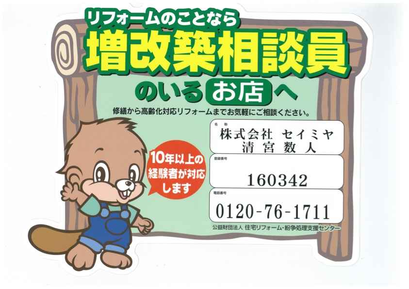 また、セイミヤは増改築相談員が在籍している施工店です。住宅のリフォーム工事に関する実務経験を10年以上有し、「公益財団法人住宅リフォーム・紛争処理支援センター」が企画した住宅リフォーム工事に関する専門知識を習得するための研修を受講し、考査に合格すると、増改築相談員として登録されます。