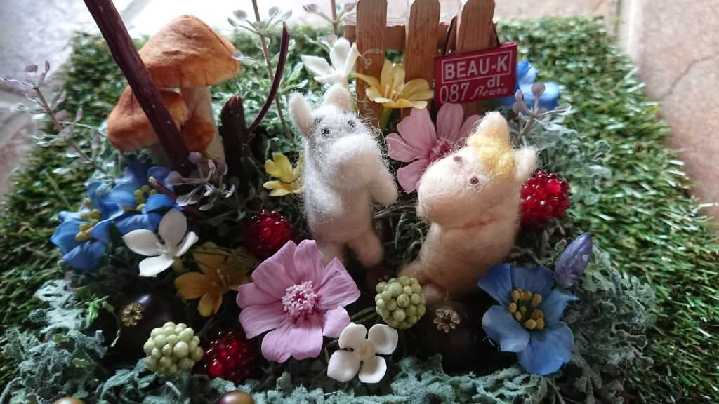 お客様持参の手作りムーミンを入れた箱庭アレンジです