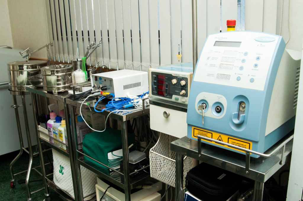 7階の様子です。手術室とは別に、手術後に休憩していただくための回復室もございます。手術台には、リラックス効果のあるボディソニックを設置しています