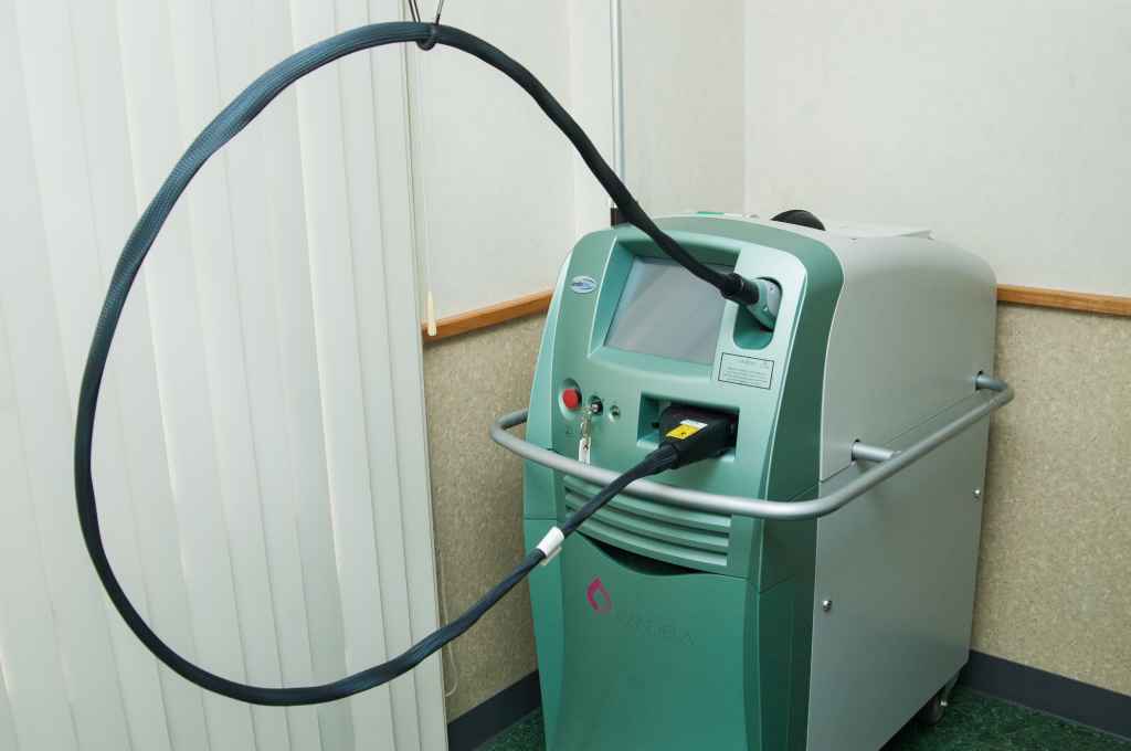 LaserProダイオードレーザーです(右)。出力が980nmの波長を持つレーザー照射により、患部以外の組織の損傷を行なうことなく的確にスポット治療を行なうことができます