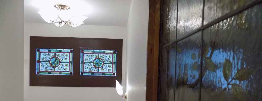 7階へ続く階段にも、アンティークのステンドグラスがございます