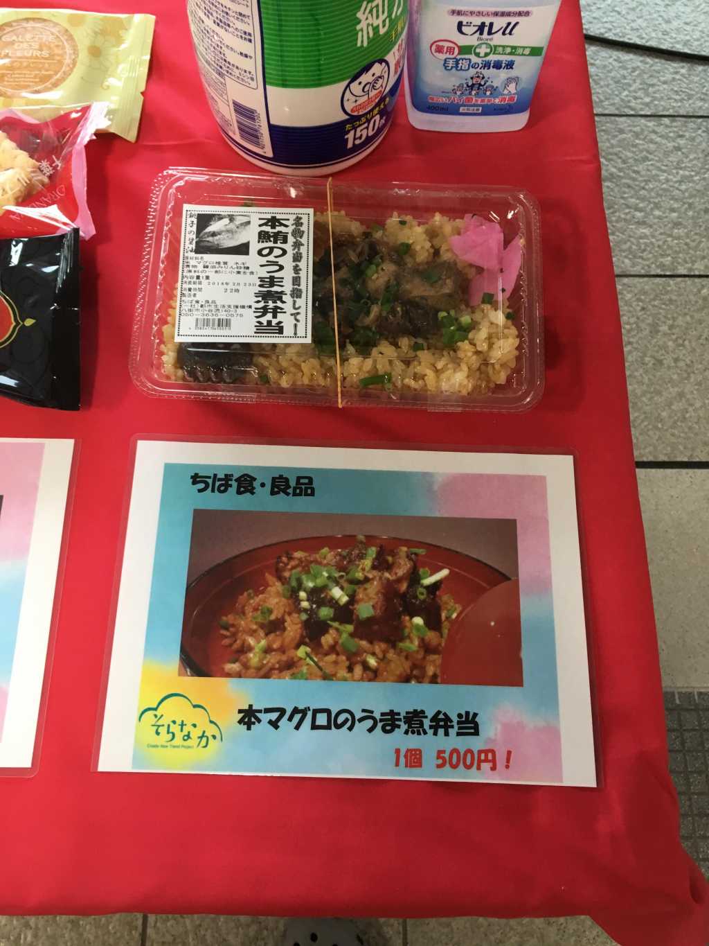 千葉都市モノレールで開催されましたちばのいいもの品評会にご参加くださいましてまことにありがとうございます。本マグロのうま煮弁当をお気に召してくださいましてうれしい限りです。現在、お昼のモノレール千葉駅改札口と千葉県教育会館前でランチ弁当の販売をしておりますのでお近くの際はお立ち寄りください。 チーバくんメンチはイベント時の販売をしており、普段販売しておりませんが、3月18日銚子で開催れるマルシェにて銚子のキャベツを使用した銚子のキャベツメンチ(チーバくんメンチ)を揚げたて販売を予定しております。詳しくは ちば食・良品のTwitterをご覧ください。