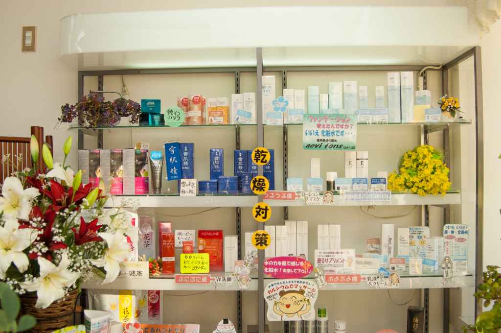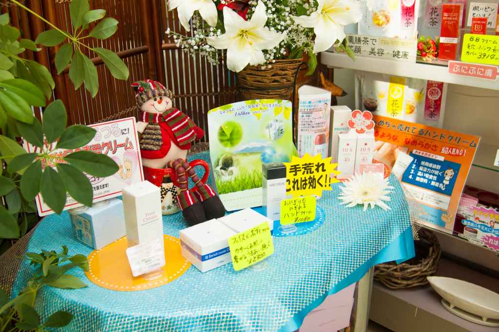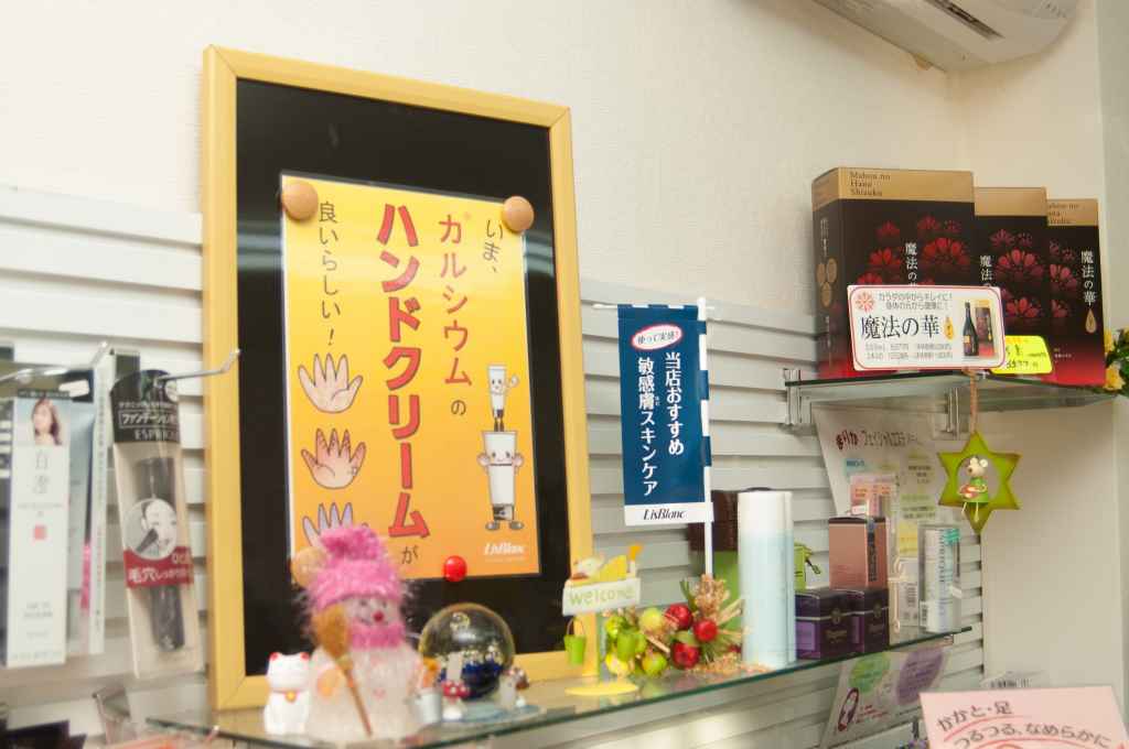店内には化粧水や美容液、ハンドクリームなど、当店がオススメしている美容グッズを多数取り揃えております。