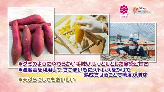 ・グミのようにやわらかい手触り、しっとりとした食感と甘さ ・温度差を利用して、さつまいもにストレスをかけて熟成させることで糖度が増す ・天ぷらにしてもおいしい