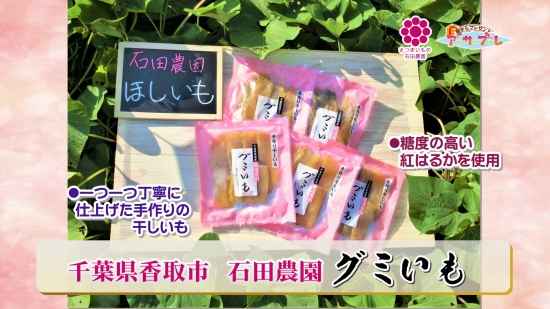 江戸時代から続くさつまいも農家です。千葉県北東部に位置する石田農園では、7ヘクタールの土地でさつまいもを栽培、その他「グミいも」という干しいもを作って販売しています。おいもをより美味しく食べてもらえるために、日々お芋を作っています。