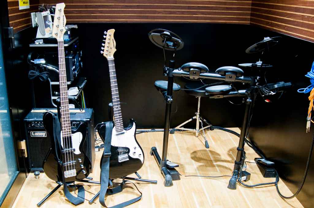 スタジオルームでは、電子ドラム・エレキギター・アコースティックギターを設置しており、バンド気分を味わうことができます。