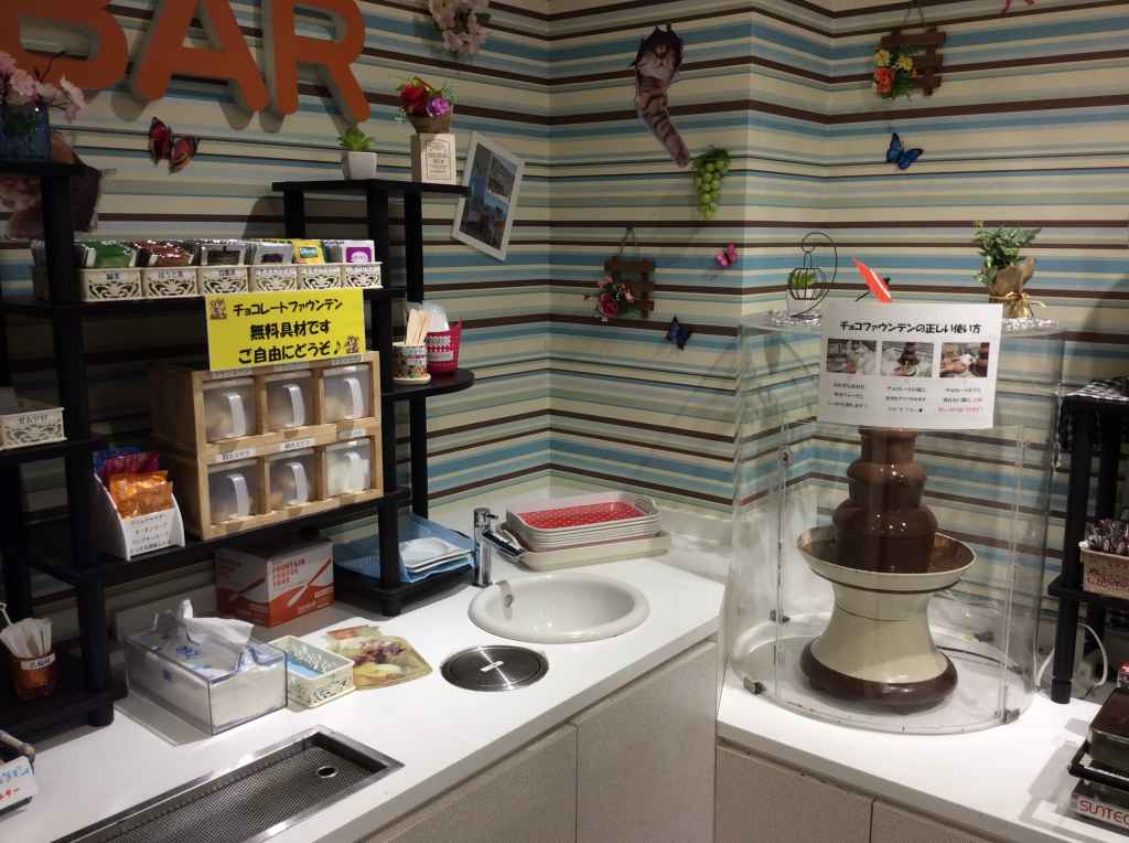 チョコレートファウンテンが食べ放題です! お好きな具材を付けてどうぞ。