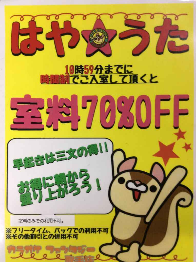 10時59分迄にご入室のドリンクバー時間制のお客様は室料70%off