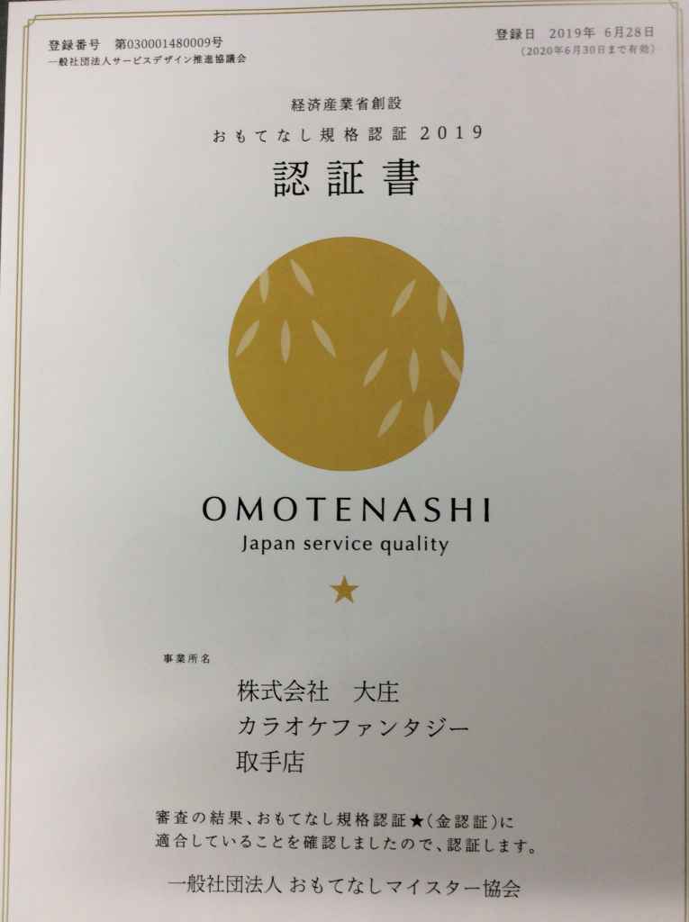 経済産業省認定[おもてなし認証] 11月1日より開始致します。