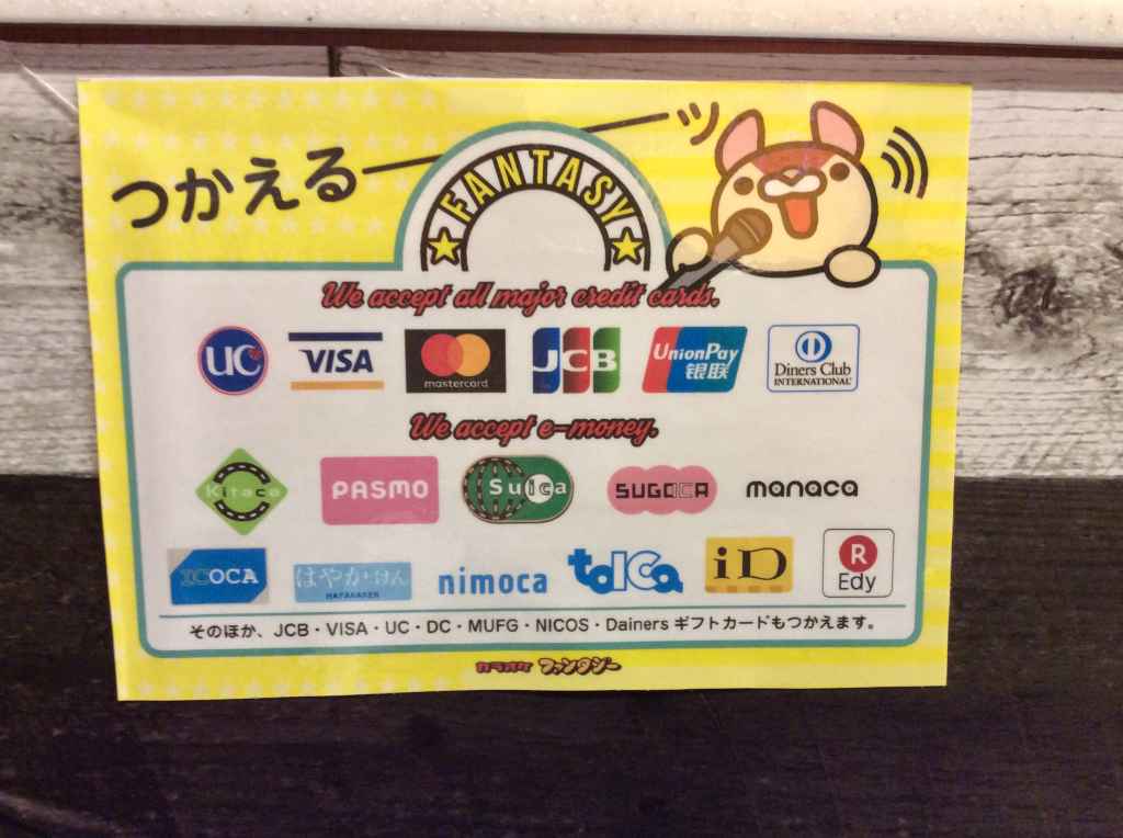 利用可能クレジット:SAISON CARD INTERNATIONAL、UC、Master Card、VISA、R Edy(楽天Edy)、iD、JCB、Diners Club INTERNATIONAL、UnionPay銀聯カード、ICカード(Suica、PASMO、Kitaca、manoca、tolca、icoca、はやかけん、nimoca、sugoca)