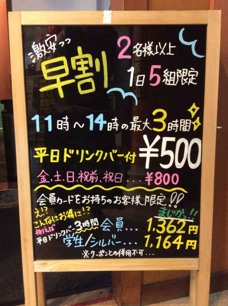 11時~14時の最大3時間でドリンクバー付き500円(税込)の早割プランございます! ※金、土、日曜日、祝前日、祝日は800円(税込)となります。 とにかく激安価格です!!
