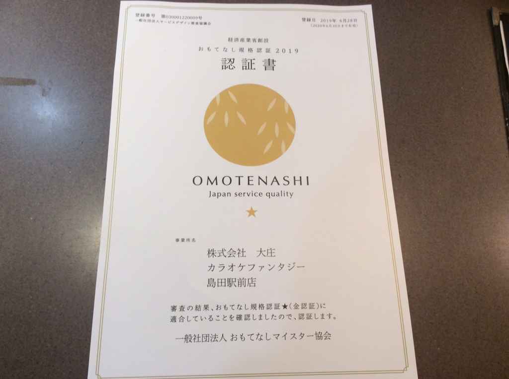 カラオケファンタジーがおもてなし規格認証において金認証を取得致しました!