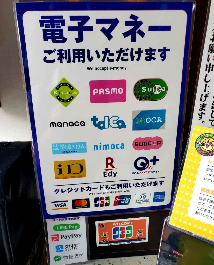 利用可能クレジット:SAISON CARD INTERNATIONAL、UC、Master Card、VISA、R Edy(楽天Edy)、iD、JCB、Diners Club INTERNATIONAL、UnionPay銀聯カード、ICカード(Suica、PASMO、Kitaca、manoca、tolca、icoca、はやかけん、nimoca、sugoca)