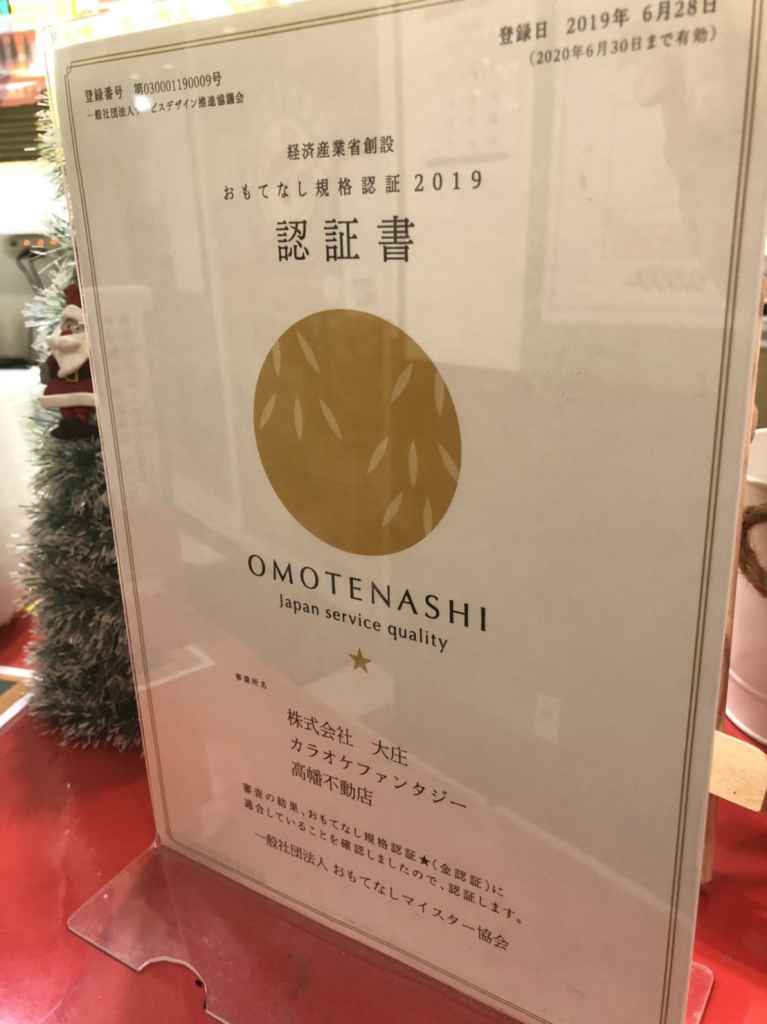 当店はおもてなし認証取得いたしました。