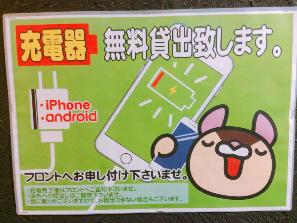 iPhone、Android用充電器無料貸出中!!Type-Cもご用意しております。