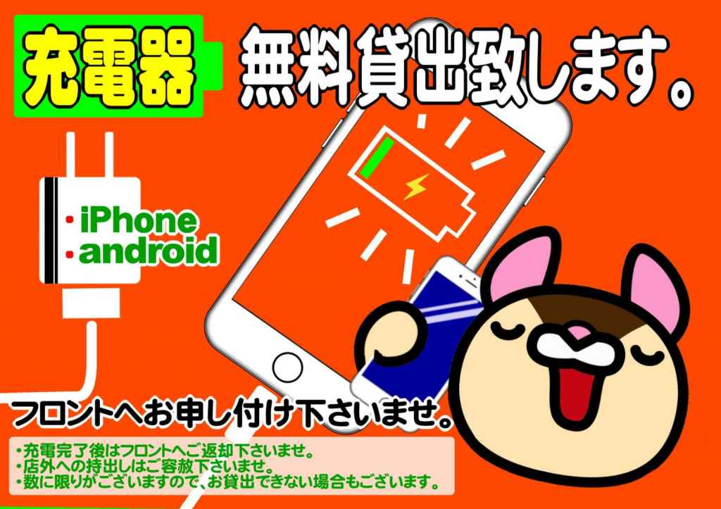 スマホ充電機無料貸し出ししてます♪