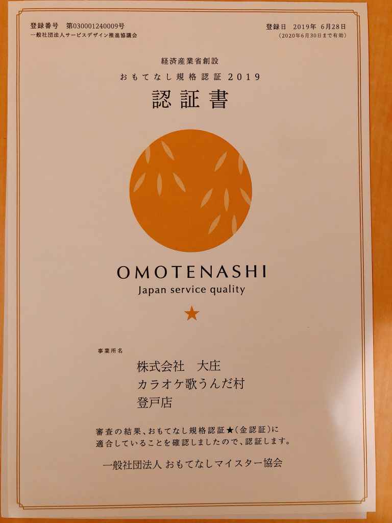 歌うんだ村登戸店がおもてなし規格認証(金認証)店舗に認証されました!!