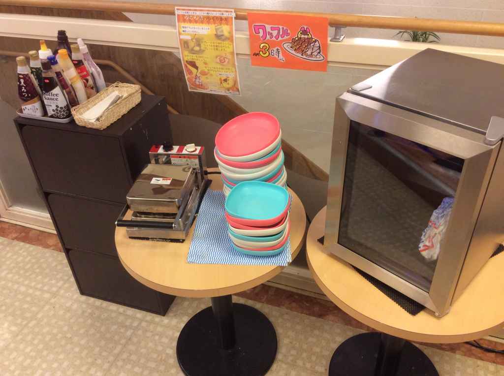 ワッフルを焼いて、ソフトクリームをかけて、ソースをかけて‼︎美味しい‼︎これがなんと無料で使い放題‼︎