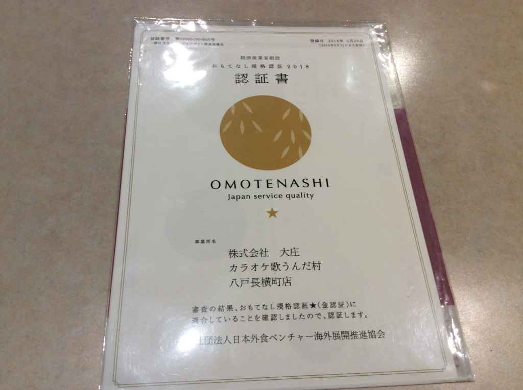当店を始めとした歌うんだ村、カラオケファンタジーがおもてなし規格認証金認証に認定されました