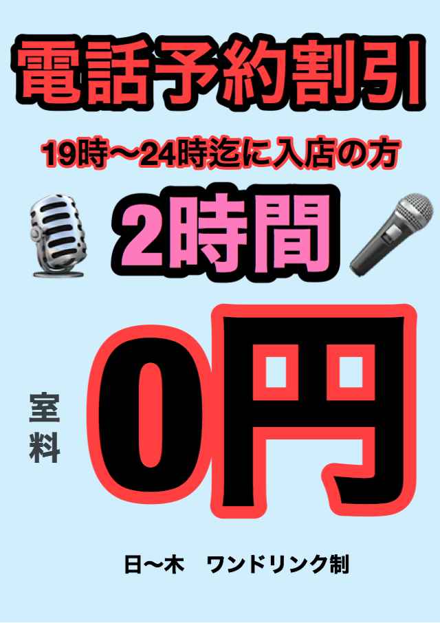 電話予約の来店で 日~木 18時~24時迄来店 2時間室料0円 ワンドリンク制 2時間ドリンクバー700円・2時間飲み放題1500円 -
