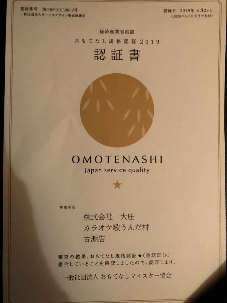 この度歌うんだ村古淵店、、、おもてなし規格認証の金賞を取得致しました♪これも日頃よりご利用頂くお客様や近隣の方々、そして従業員一同の頑張りのおかげです。ありがとうございます!