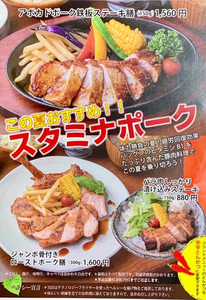 にこにこポーク(キャベツ付き)単品 200g 830円(税別) 300g 1,030円(税別) ●ご飯・味噌汁又は、豚汁・お新香セット 320円(税別) ●豚汁(単品)200円(税別) ※ごはん、味噌汁おかわり自由 ※豚汁おかわり1杯50円(税別) ※キャベツのおかわりは30円(税別)