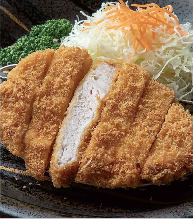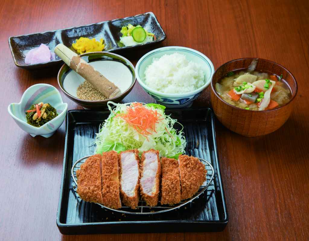 オーガニック理念で育んだ純粋黒豚コースかつ定食 (小)1,380円(税別)。 カナディアンロッキー連山をカナダはアルバータ州のサンテラ農場の自社で作る大麦、小麦を主体とした飼料を与え、オーガニック理念のもと飼育された血統100%の純粋バークシャー種黒豚です。