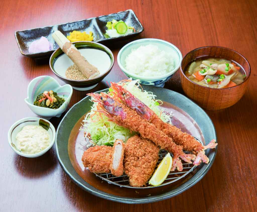 当店は海鮮かつも大人気!こちらは『極上ひれと海老フライプレート』です