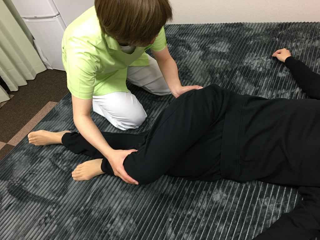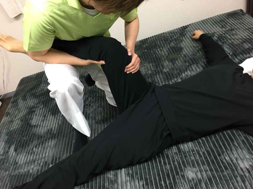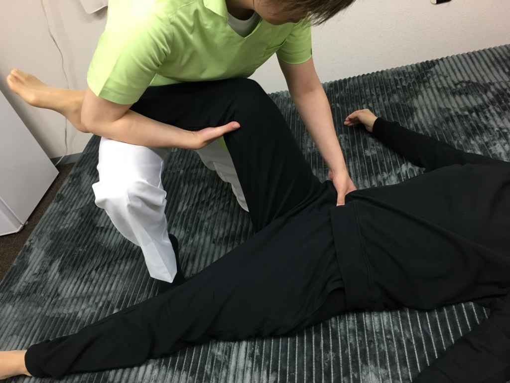 施術風景。知良です。骨盤がズレて、股関節が開いてました。2